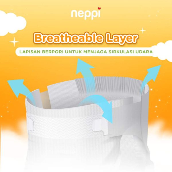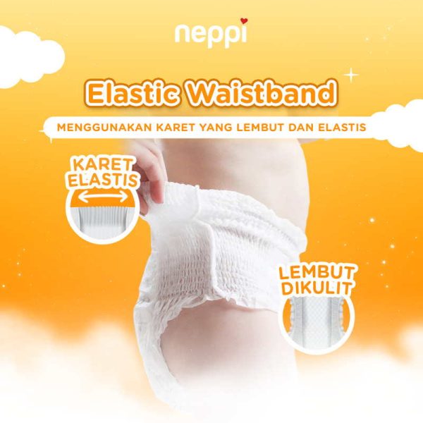 Neppi Popok Bayi Celana Diapers Pants L 26 – 6 Pack. Neppi Premium Diapers Pants diciptakan khusus dengan bahan lembut dan berkualitas untuk memberikan kenyamanan saat dipakai si Kecil dalam aktivitas sehari-harinya. Didesain untuk membalut pinggang dan daerah pipis bayi agar proses penyerapan urin lebih cepat dan maksimal, sehingga tidak bocor saat digunakan. Polymer yang menyebar rata pada popok, menjadikan permukaannya selalu kering untuk mengurangi resiko terjadinya iritasi kulit.